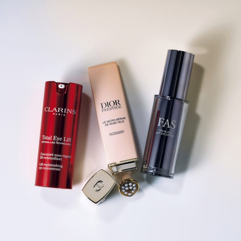 1.目の下・目尻・上まぶたの全方位で力強さをサポート。まつ毛ケアもできる。FAS ザ ブラック リフト アイ クリーム 15g ¥16,500(シロク) 2.目元の疲労感を招く銅不足に着目。パール感のあるセラムで塗った直後から明るく輝く目元に。プレステージ マイクロ セラム ユー 20mL ¥30,800(パルファン・クリスチャン・ディオール) 3.目元をピンと引き締めながら、表面をなめらかに整えてすっきりした印象に。まつ毛ケアもできる。トータル アイ インテンス N 15mL ¥12,760(クラランス)