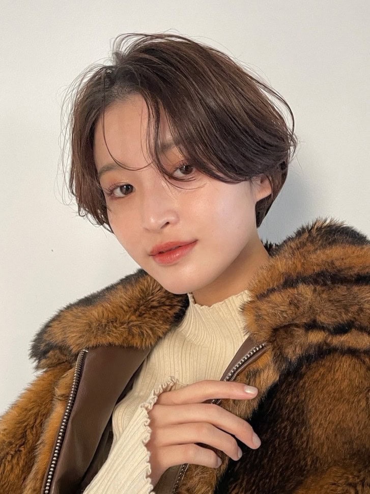 長めの前髪がそっと頬にかかり、まなざしを柔らかく見せる大人ショート。根元からふわりと空気を含んだようなボリュームが、自然体の余裕を感じさせます。サイドは軽く流れて、毛先がルーズに動くたびに表情が変わるのも魅力。コンパクトにおさめた襟足のおかげで首元がすっきり見え、厚手の冬服でも抜け感のあるバランスに。赤みを抑えたベージュカラーが、肌まで明るく透明感のある印象へ。カッコよさと可愛さが共存する、30代にこそ似合う洗練ショートです。