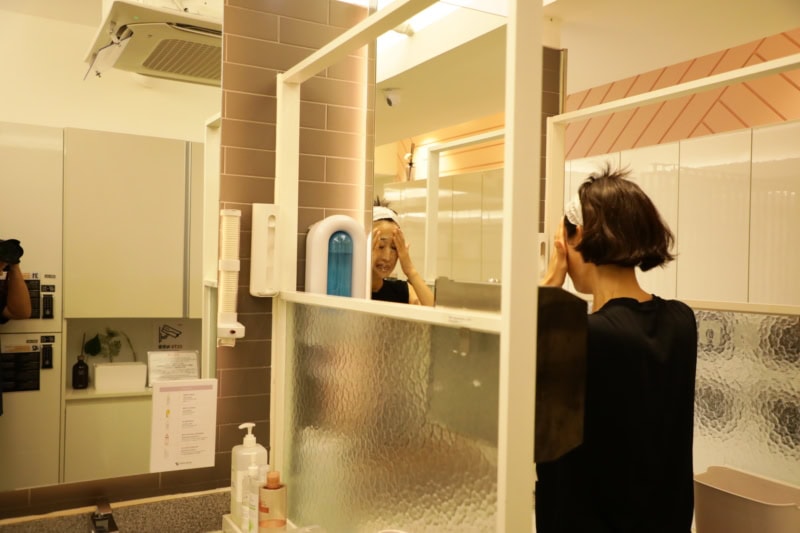 クリニック名の入ったノースリーブTシャツに着替えてパウダールームで洗顔。