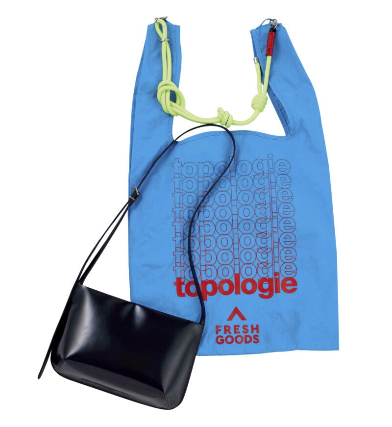 エコバッグはハンドル部分にネオンイエローのストラップをつけてワンハンドルのように。黒のミニショルダーでモダンに引き算。ショルダーバッグ[H17×W25.5×D6] ¥33,000(ハァウ/ウィム ガゼット ルミネ新宿店) エコバッグ[H41×W38×D12] ¥6,490、エコバッグにつけたバッグショルダー¥4,730(ともにトポロジー/トポロジー フラッグシップ ショップ)