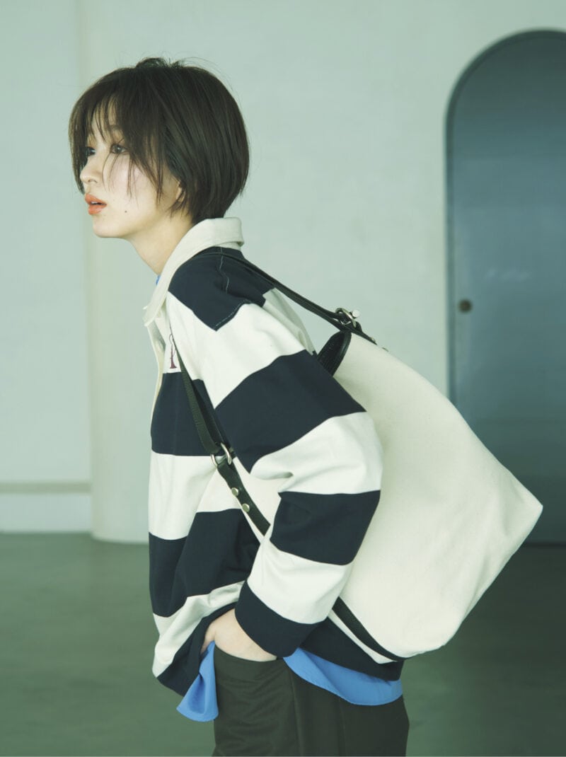ワンハンドルバッグもキャンバス地ならカジュアルに持ちやすい。2本のストラップを束ねた肩掛けも、ラガーシャツによく似合う。バッグ[H32×W26×D12.5] ¥41,800(リエンピール/ショールーム ロイト) シャツ¥6,290、パンツ¥8,590(ともにザラ/ザラ ジャパン) 中に着たブルーシャツ¥23,100(マカフィー/トゥモローランド)