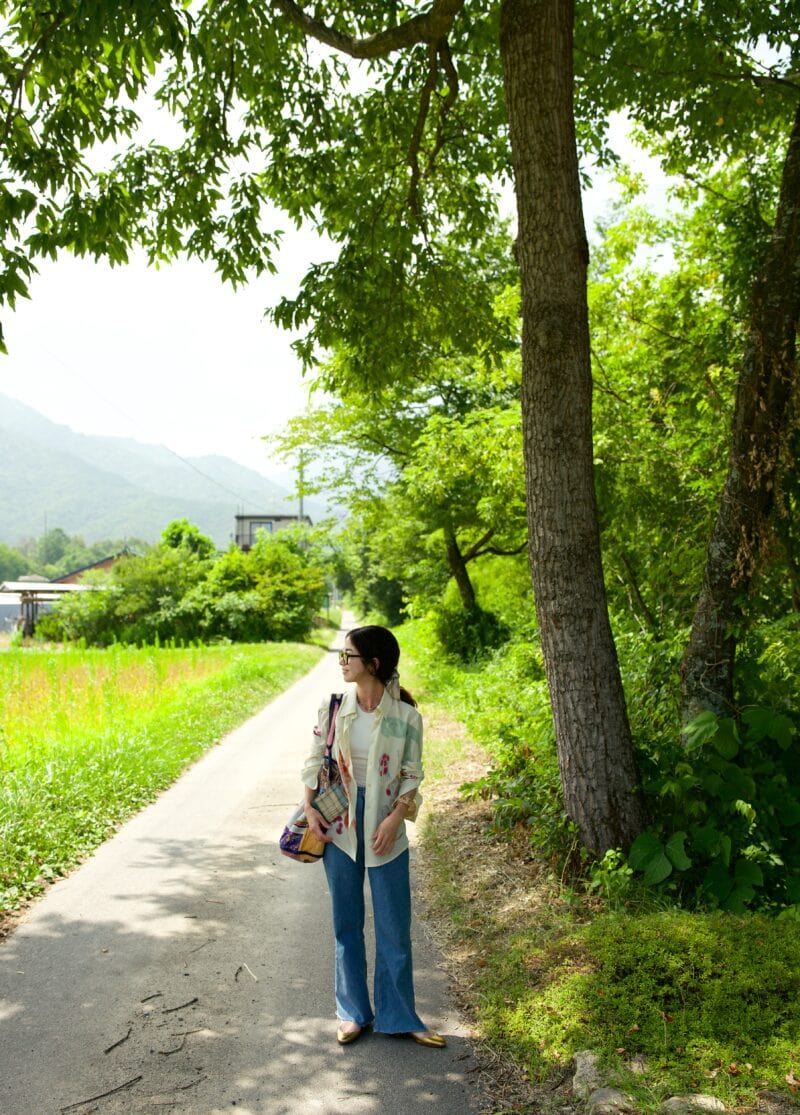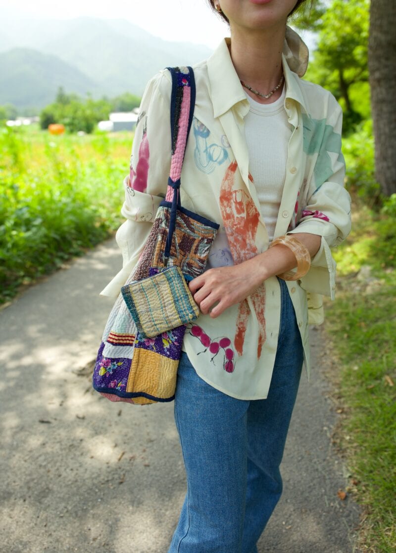 白タンク×デニムの定番コンビをベースに、ヴィンテージの柄シャツを羽織って、華やかに。PURのバッグをプラスしたのもアクセントになっています。シンプルなデニムの着こなしも、自分らしくアレンジ。
