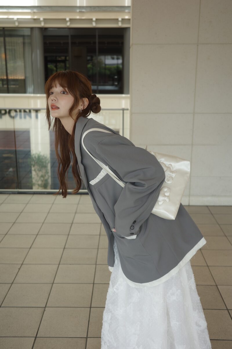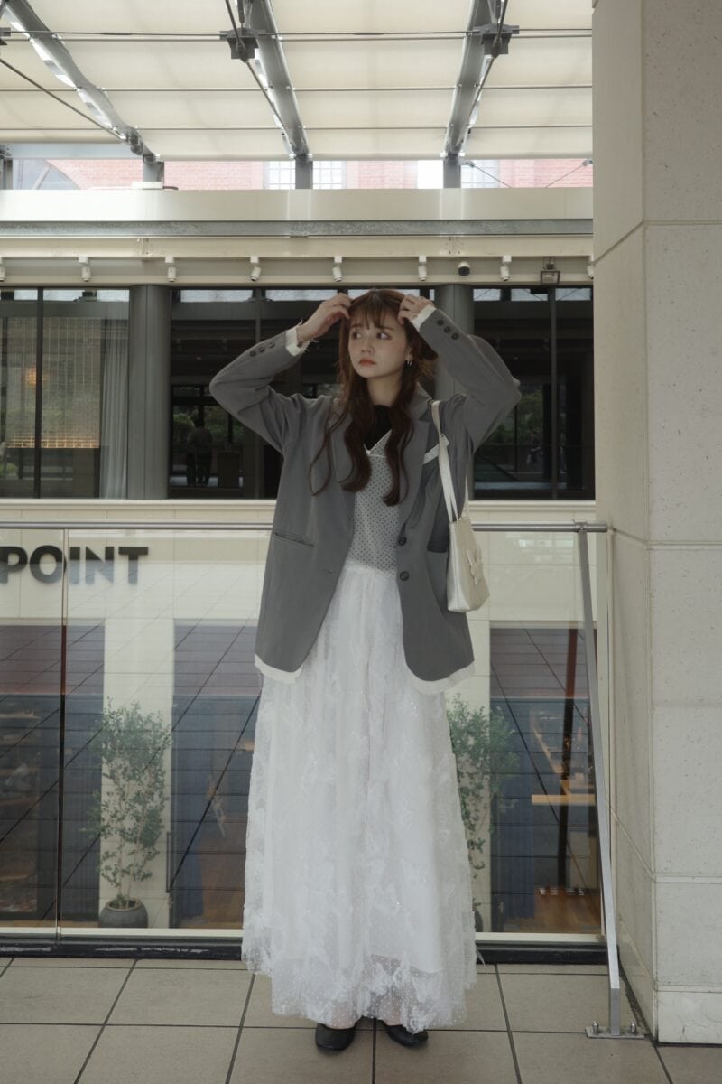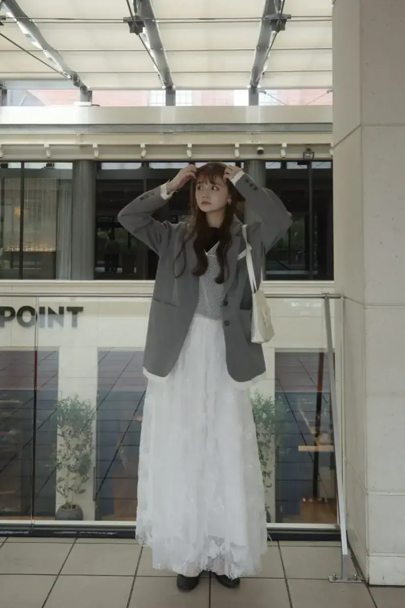 オーバーサイズのジャケットを使ったハンサムコーデ。ボトムはボリューミーなチュールスカートをチョイスし、スイートな雰囲気に。ライトグレーと白の組み合わせで、軽やかな配色でまとめているのも上級テクです。