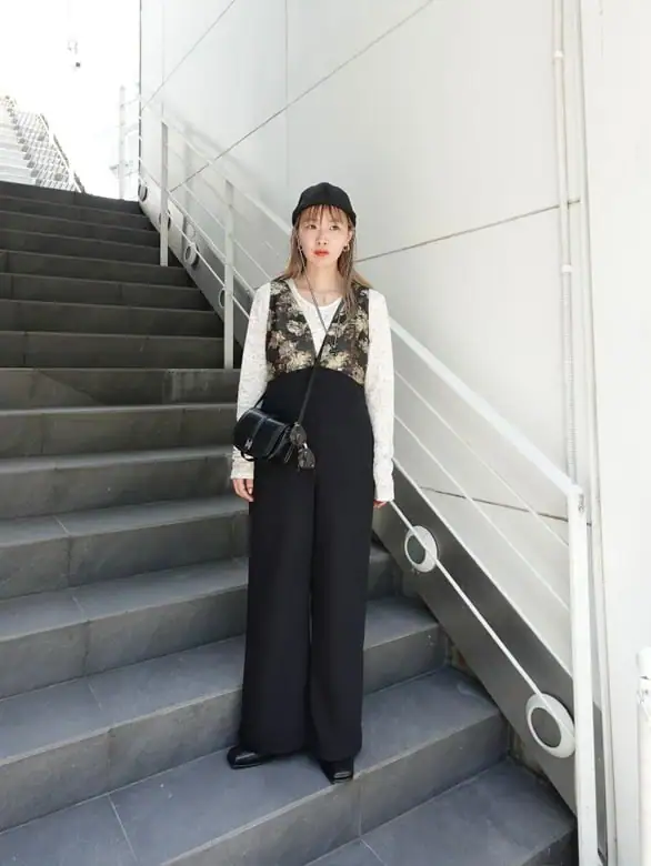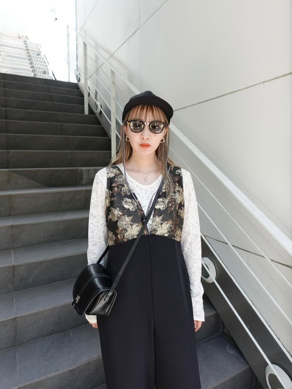 個性的な切り替えデザインのオールインワンを使ってスタイリング。ハイウエストのデザインに加えて、インには白トップスをレイヤードしているので、自然と視線が上に集まります。トップスはレース素材なので、涼しげで、エレガントなエッセンスも足してくれます。キャップを使って抜けを作ったのも、上級者らしいテクニック!