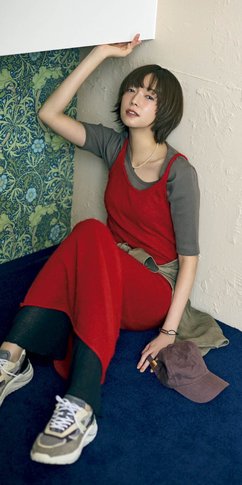 色の主張の強い赤だからこそ、ベーシックなニットワンピをさらりと重ねるだけで瞬時に今年っぽさが拡大。トッピングする小物も、赤と同系統のぬくもりを感じるブラウンでまとまりよくなじませて。ワンピース¥19,800(エミ/エミ ニュウマン新宿店) リブカットソー¥8,800(サロン アダム エ ロペ/ジュンカスタマーセンター) レギンス¥9,990(インティミッシミ/インティミッシミ 渋谷文化村通り店) 腰に巻いたシャツ¥29,700(ウィム ガゼット/ウィム ガゼット ルミネ新宿店) キャップ¥18,780(プロタゴニスタ/アマン) ネックレス¥23,320(フル・オブ・グレイス/ズットホリック) ブレスレット¥16,500(アダワットトゥアレグ/ザ エディット ストア) スニーカー¥41,800(デイト/ティースクエア プレスルーム)