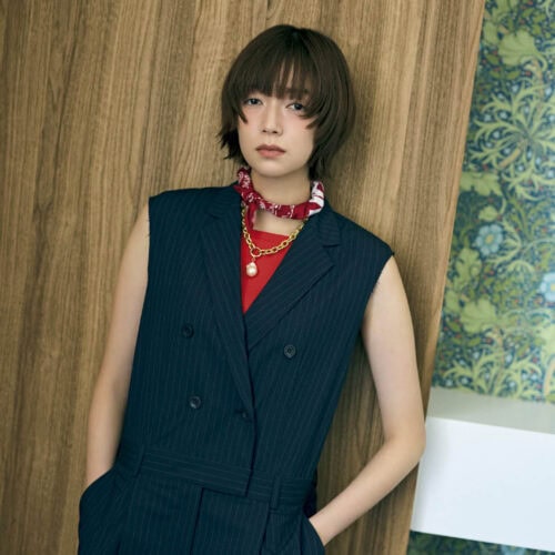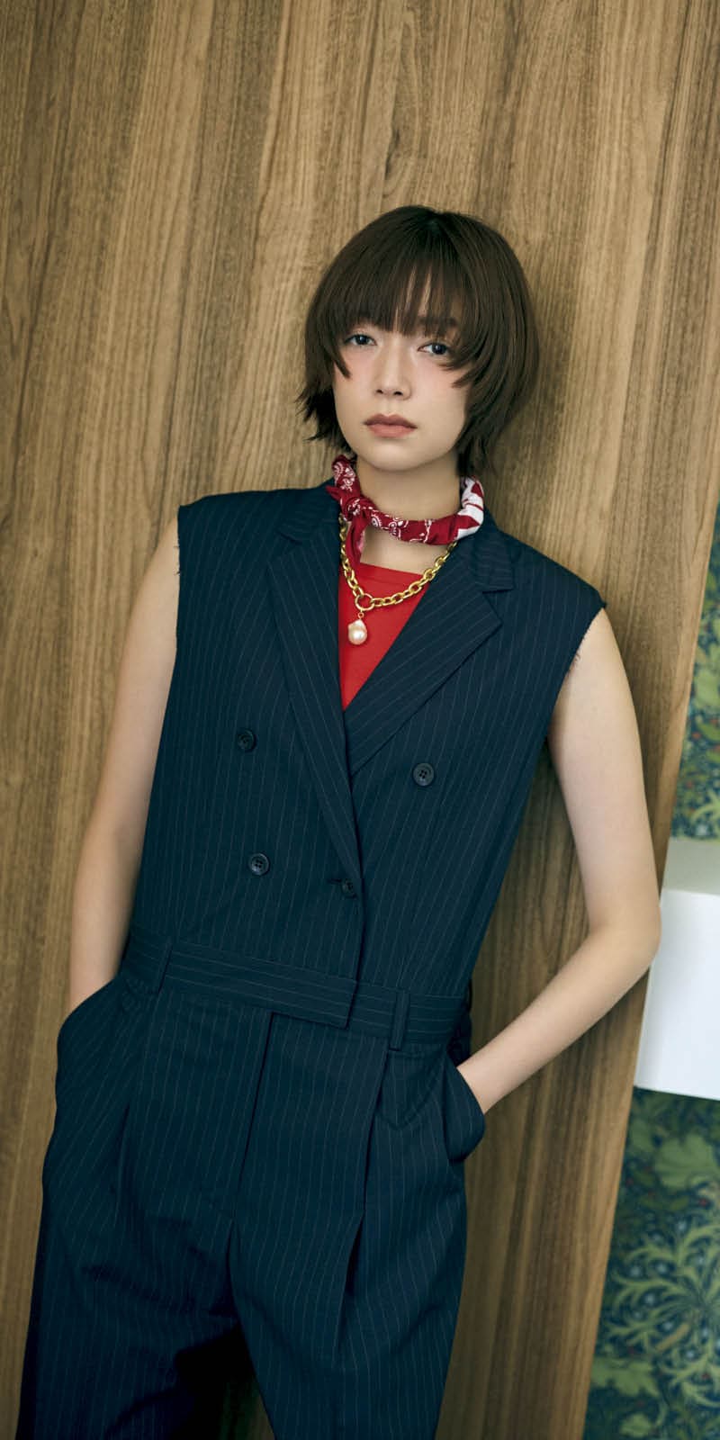 旬を薫らせる差し色として、チラッと覗くインナーやアクセを抜擢。赤の効果でスタイリングに差がつく。ニットキャミソール¥7,700(ノーク) バンダナ¥1,650(ザ シンゾーン/シンゾーン ルミネ新宿店) ジャンプスーツ¥29,700(ザ ポーズ/ウィム ガゼット ルミネ新宿店) ネックレス¥55,220(フル・オブ・グレイス/ズットホリック)