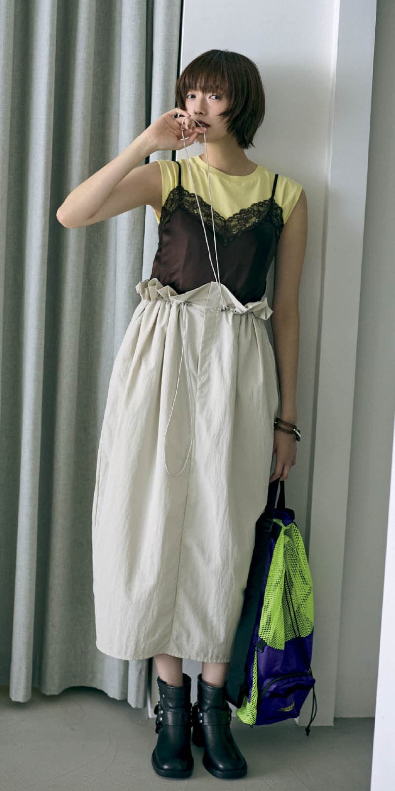 レース&シルクが色気を誘うキャミをヘルシーなタンクに重ねて。スポーティなテイストとのMIX感がレイヤード上手に映る。キャミソール¥12,990(インティミッシミ/インティミッシミ 渋谷文化村通り店) トップス¥5,500(アングリッド) スカート¥23,100(HER.) バッグ¥4,950(スピード/ゴールドウイン カスタマーサービスセンター) ブレスレット¥23,540(ブランチ・ジュエリー/ズットホリック) ショートブーツ¥40,700(モリーニ/ジャック・オブ・オール・トレーズ プレスルーム)