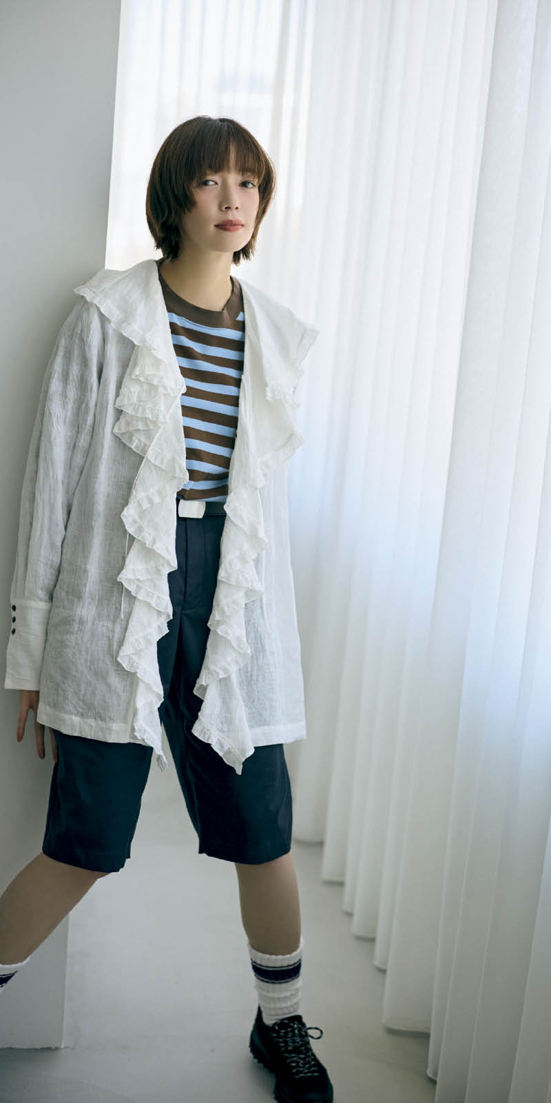 フリルのディテールが今っぽさを呼び込むシャツをさらりと。ボーダーとハーフパンツのボーイズライクなルックスに、こなれ感と今っぽさが光る。シャツ¥39,600(ウーア/シップス インフォメーションセンター) ボーダーロングTシャツ¥8,910(ビームス ボーイ/ビームス ボーイ 原宿) ハーフパンツ¥24,200(HER.) ベルト¥12,100(アンヌーク/アンヌーク 新宿ルミネ2店) ソックス¥3,520(トウキョウ ウィークリー ジャーナル/バロックジャパンリミテッド) スニーカー¥20,900(キーン/キーン・ジャパン合同会社)