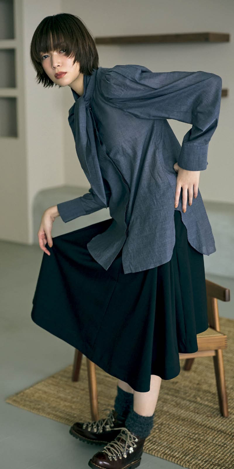 華やかさを纏えるボウタイリボンがまるでアクセ感覚。決して可愛らしさだけじゃなく、落ち着いたカラーや立体的なボリューム袖などのこだわりディテールで、ビターな甘さを宿すボウタイブラウスが一枚で即おめかし感。ブラウスの裾をアウトして、アシンメトリーな丈感のスカートとのモードに浸れるスタイリングでハイセンスに。ブラウス¥52,800(カオス/カオス表参道) スカート¥26,000(コス/コス 青山店) ソックス¥3,960(シックストックス/ノーデザイン) ショートブーツ¥96,800(パラブーツ/パラブーツ青山店)