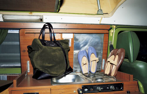左:馬具から着想を得たレザーストラップと、くったりとした上質なスウェードがリラクシーな抜け感を作る。トップハンドルは長さ調整可能。バッグ[H42×W44×D11]¥330,000
