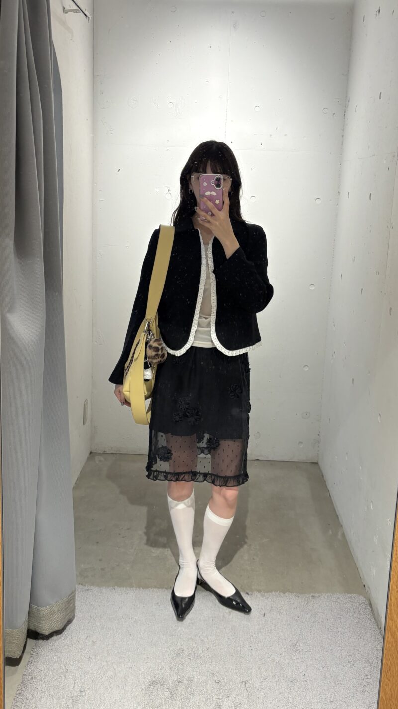 モノトーンでクラシカルな雰囲気でまとめた、秋のコーディネイトです。白フリル付きのジャケットや、NEUNAのキレイめインナーを使って重さをセーブ。着こなしのカギは、idemのシアースカート。ほどよい透け感を楽しめ、秋コーデにマッチします。