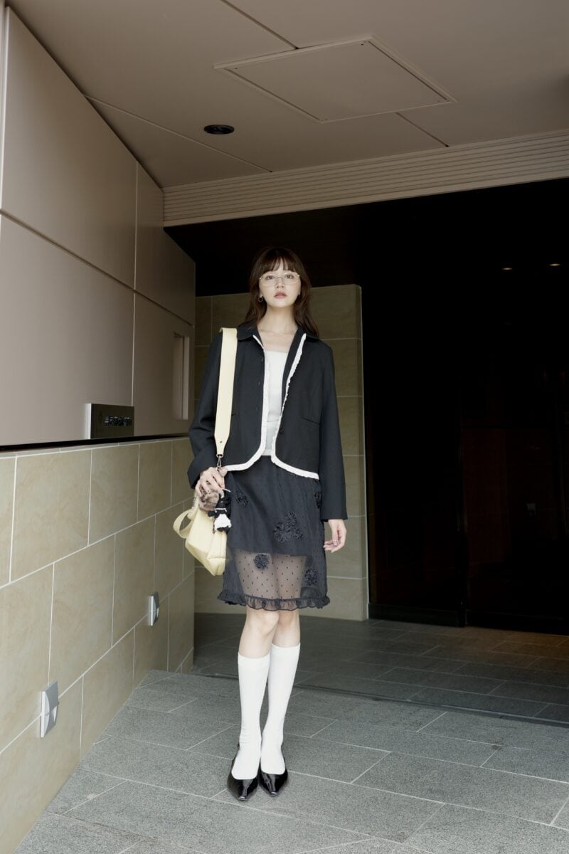 モノトーンでクラシカルな雰囲気でまとめた、秋のコーディネイトです。白フリル付きのジャケットや、NEUNAのキレイめインナーを使って重さをセーブ。着こなしのカギは、idemのシアースカート。ほどよい透け感を楽しめ、秋コーデにマッチします。
