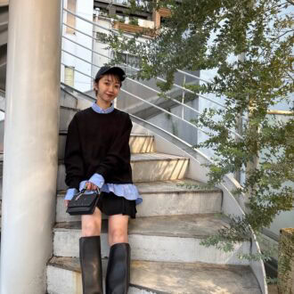 【30代スナップ】「ユニクロ」のスウェット×ミニスカでスタイリッシュに。コスパ服の着こなしのカギはブラックアイテムを多めにチョイス