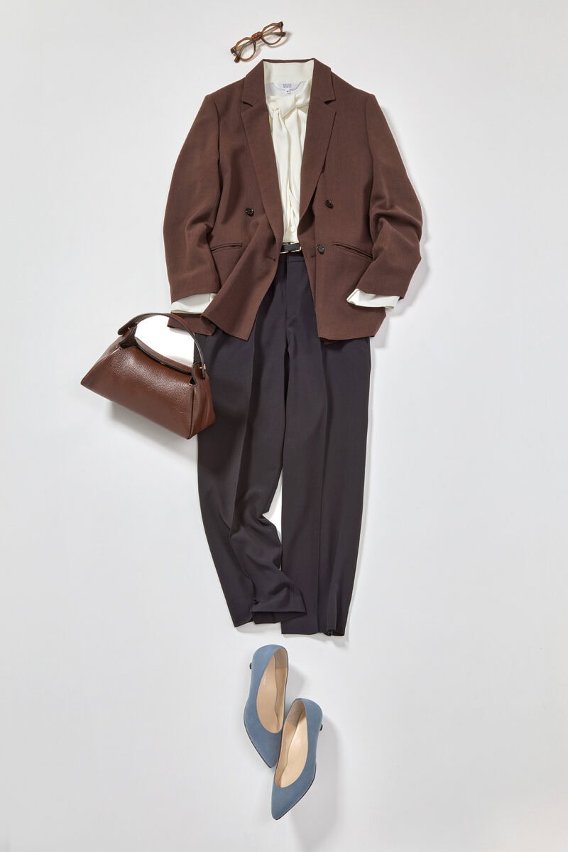 リモート打ち合わせが続く日は、長時間座り続けてもシワになりにくく、快適なフィット感のパンツが頼もしい存在。きちんと感もお洒落さも顔映えも叶える、ブラウンのジャケットとボウタイブラウスで品よく素敵に。パンツ¥5,390(みんなのスーツ/洋服の青山 池袋東口総本店)