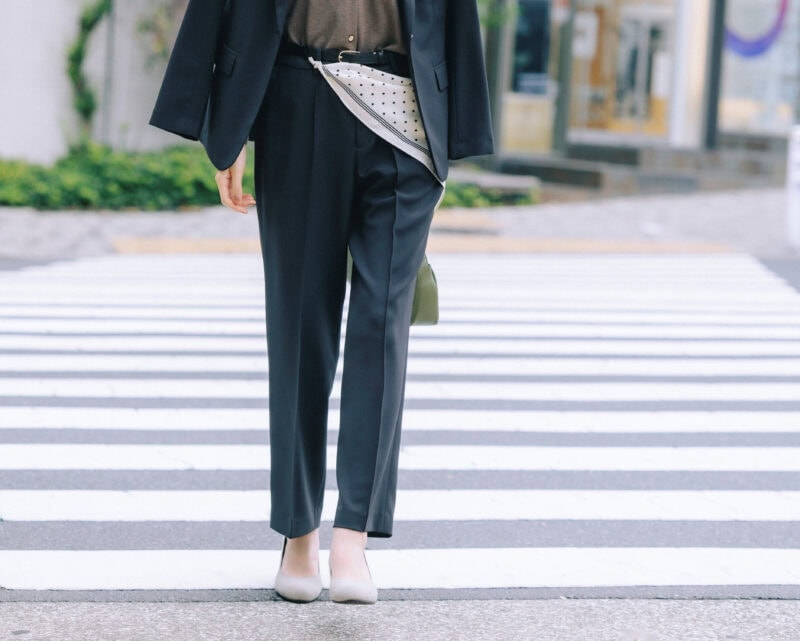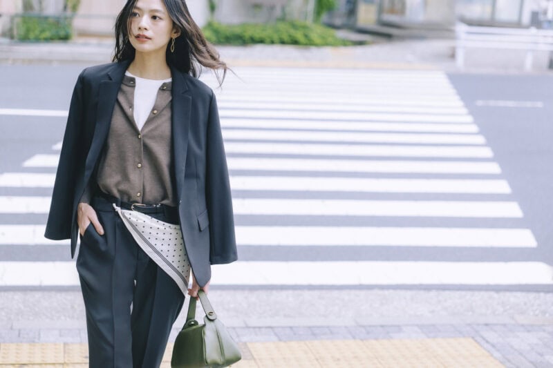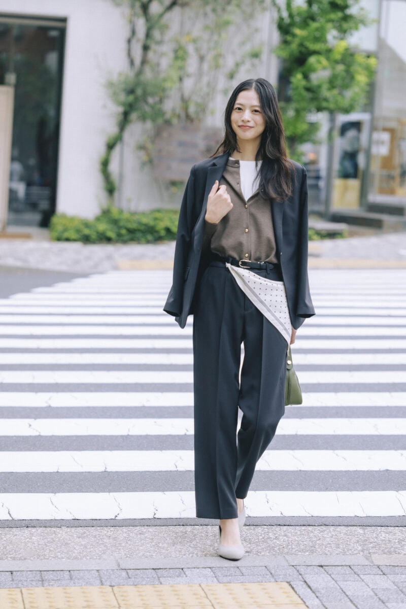 仕事後に推しが出る舞台の観劇へ。凜としたジャケパンスタイルもインナーのカーディガンや小物使いで堅苦しさを適度に和らげて。念願の舞台観劇に心躍るけど、オンオフの切り替えはしっかりと! 仕事後はスカーフを腰巻きして、セットアップスーツを今年らしくアップデート。ジャケット¥7,590、パンツ¥5,390(ともにみんなのスーツ/洋服の青山 池袋東口総本店)