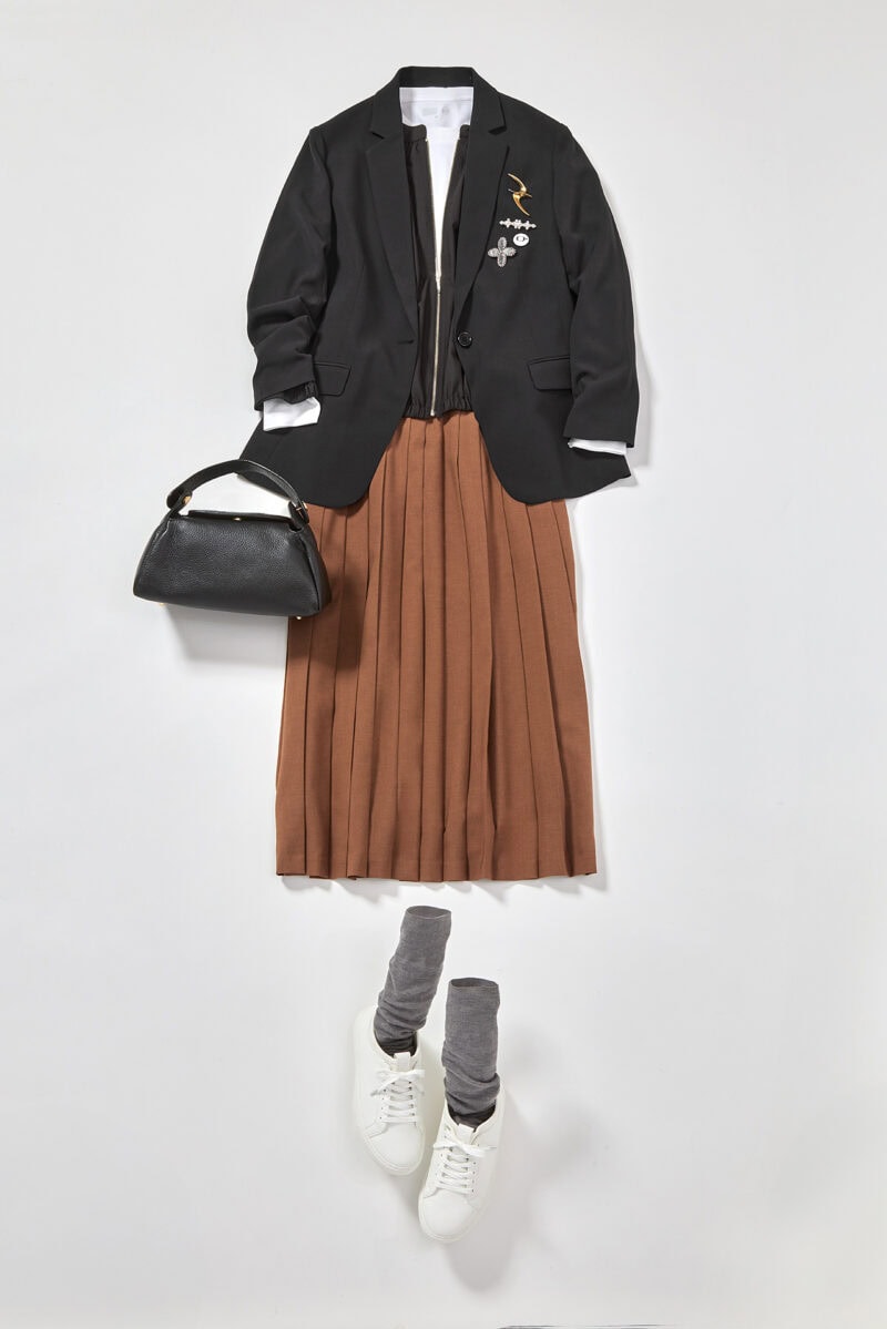 プロジェクトの資料を探すため書店やギャラリー巡り。キレイめなプリーツスカートは甘くなりすぎないように、ジャケットやブルゾンでシーズンらしいトラッドな要素をプラス。足元はスニーカーでカジュアルに引き寄せて。ジャケットの胸もとにブローチをトッピングして、休日ならではの自分らしい装いに。ジャケット¥7,590(みんなのスーツ/洋服の青山 池袋東口総本店)
