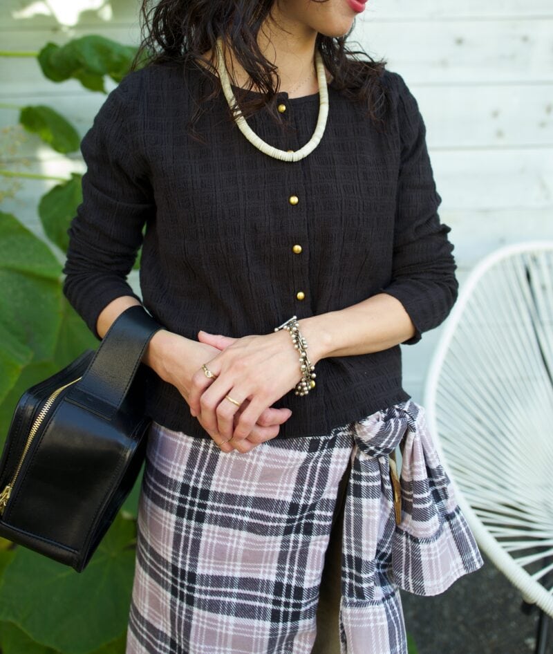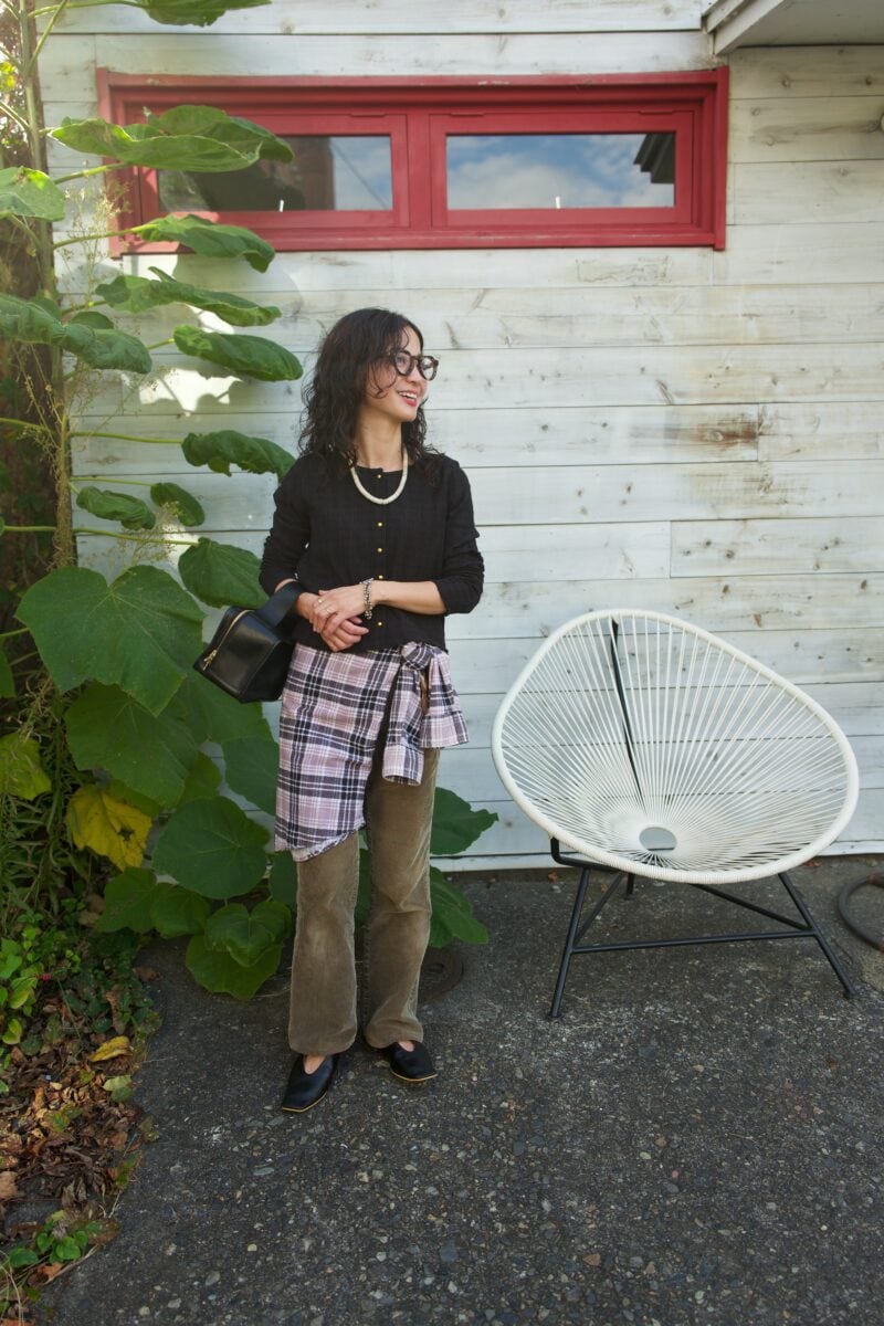 黒やカーキを使った、秋にぴったりなシックな色合いのスタイリングをスナップ。古着のアイテムを使っているので、こなれた雰囲気も演出できます。さりげなく腰に巻いたチェックシャツが、アクセントとして活躍。遊びのある上級者コーデに格上げしています。