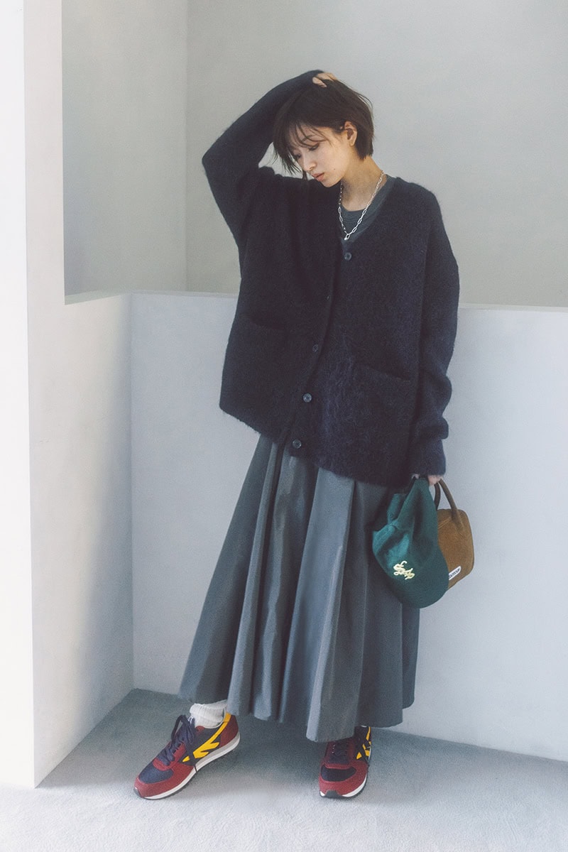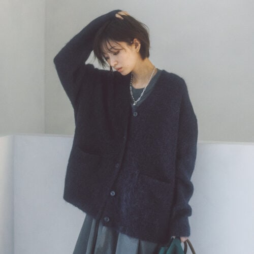 さらりと羽織れて肌寒い日にはアウターとしての役割をも担う頼れる厚手カーディガン。愛らしいふわふわのシャギーとゆるっとオーバーサイズでときめきを増量。プリーツスカートとのクラシックなコーデに、ストリートな小物を効かせて。