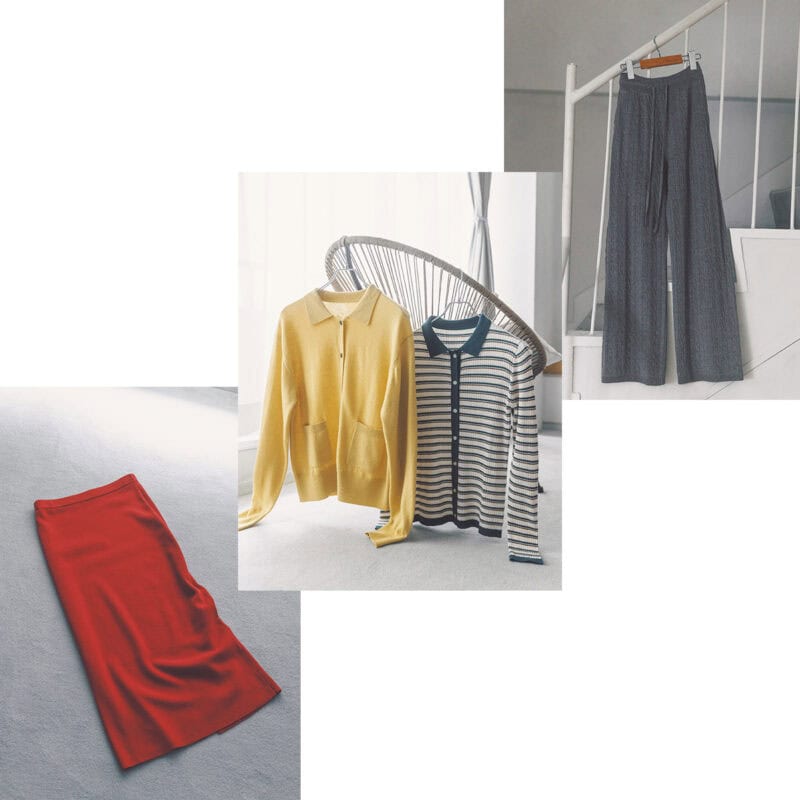 [左]顔映りが明るくなるバターイエローのニットポロは、ウール混でさらりと着られる。カーディガン、[右]着こなしの幅を広げてくれるボーダー柄。カーディガン (ともにフリークス ストア/フリークス ストア渋谷)