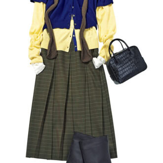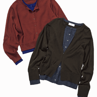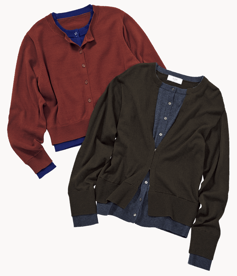 [右]カーデを二枚重ねたようなデザインが新鮮。カーディガン¥12,100(スローブ イエナ/スローブ イエナ 自由が丘店) [左]ネイビーがコーデの引き締めに一役。カーディガン¥3,399(GRL)