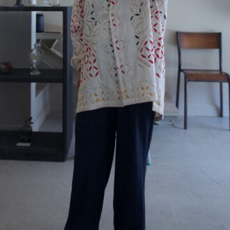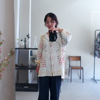 「テキスタイルの可愛いシャツが主役。穏やかなトーンの柄なので、大人でも着こなしやすいんです。ゆったりとしたパンツは古着のもの。シルエットがルーズすぎず、でも楽ちんに着られるので重宝しています。ゴールドのシューズが全体を引き締め、ほどよく洗練されたニュアンスをプラスしてくれます」(PURデザイナー 八木下泉さん)