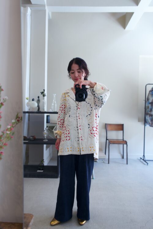 「テキスタイルの可愛いシャツが主役。穏やかなトーンの柄なので、大人でも着こなしやすいんです。ゆったりとしたパンツは古着のもの。シルエットがルーズすぎず、でも楽ちんに着られるので重宝しています。ゴールドのシューズが全体を引き締め、ほどよく洗練されたニュアンスをプラスしてくれます」(PURデザイナー 八木下泉さん)