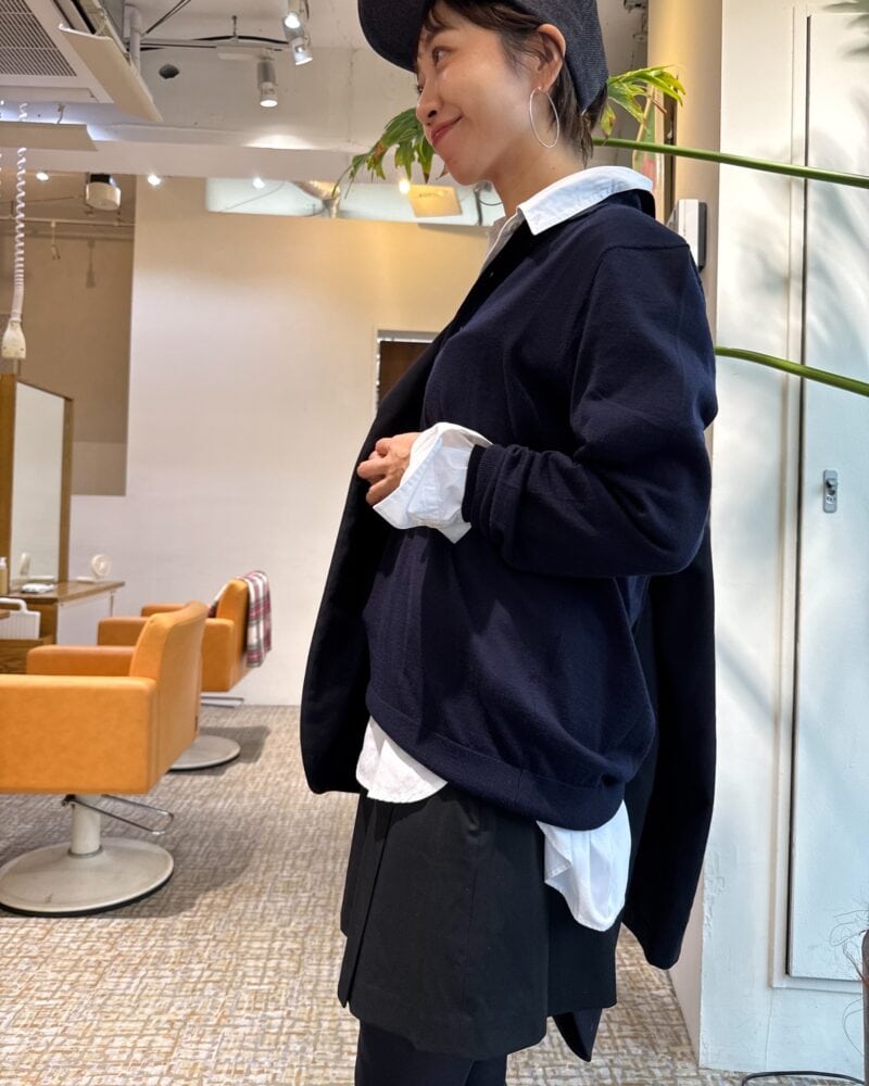 ユニクロの話題のアイテム・ポロニットセーターとスコートを取り入れつつ、センスよくまとめています。 今人気のポロニットセーターは中に白シャツを仕込んで、清潔感をプラス。ミニ丈ボトムのスコートも、黒タイツをあわせれば大人でも着こなしやすくなります。さらに、ジャケットや革靴をあわせて、きちんと感を演出しているのもさすが。