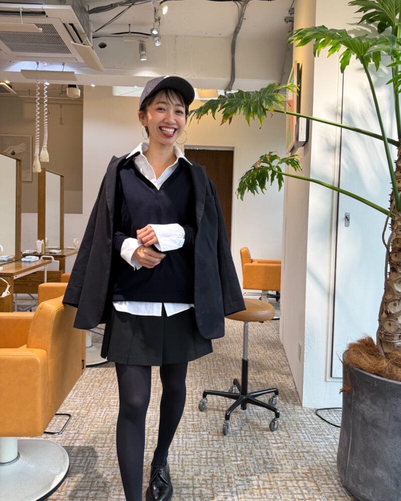 ユニクロの話題のアイテム・ポロニットセーターとスコートを取り入れつつ、センスよくまとめています。 今人気のポロニットセーターは中に白シャツを仕込んで、清潔感をプラス。ミニ丈ボトムのスコートも、黒タイツをあわせれば大人でも着こなしやすくなります。さらに、ジャケットや革靴をあわせて、きちんと感を演出しているのもさすが。
