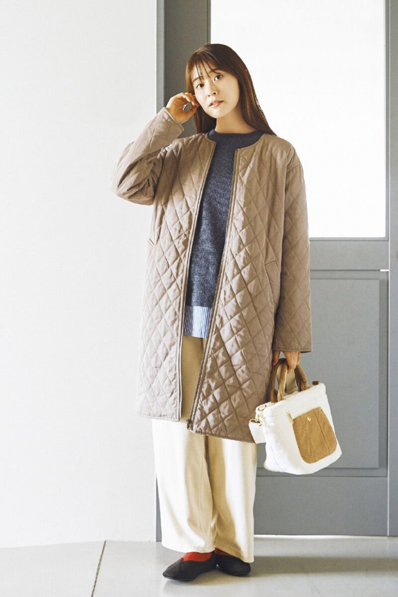 「キルティングコートは軽く、ゆったりとしたフォルムもお気に入り。プルオーバーはレイヤードデザインで、重ね着好きとしてはうれしいポイント♡ 白のパンツで抜け感をプラス(ゆべしさん)」