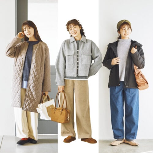 コート¥2,200、プルオーバー¥770、パンツ¥990(すべてシーズン リーズン バイ リン アンド レッド/しまむら) 靴、バッグ(しまむら参考商品)