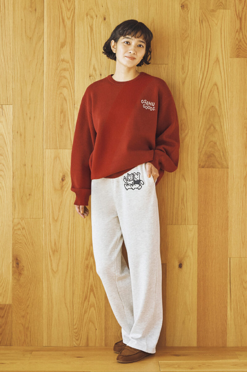 「ジル」のニットプルオーバーは「ジャック」のバッグがセット。スウェットパンツを合わせて、リラクシーに。