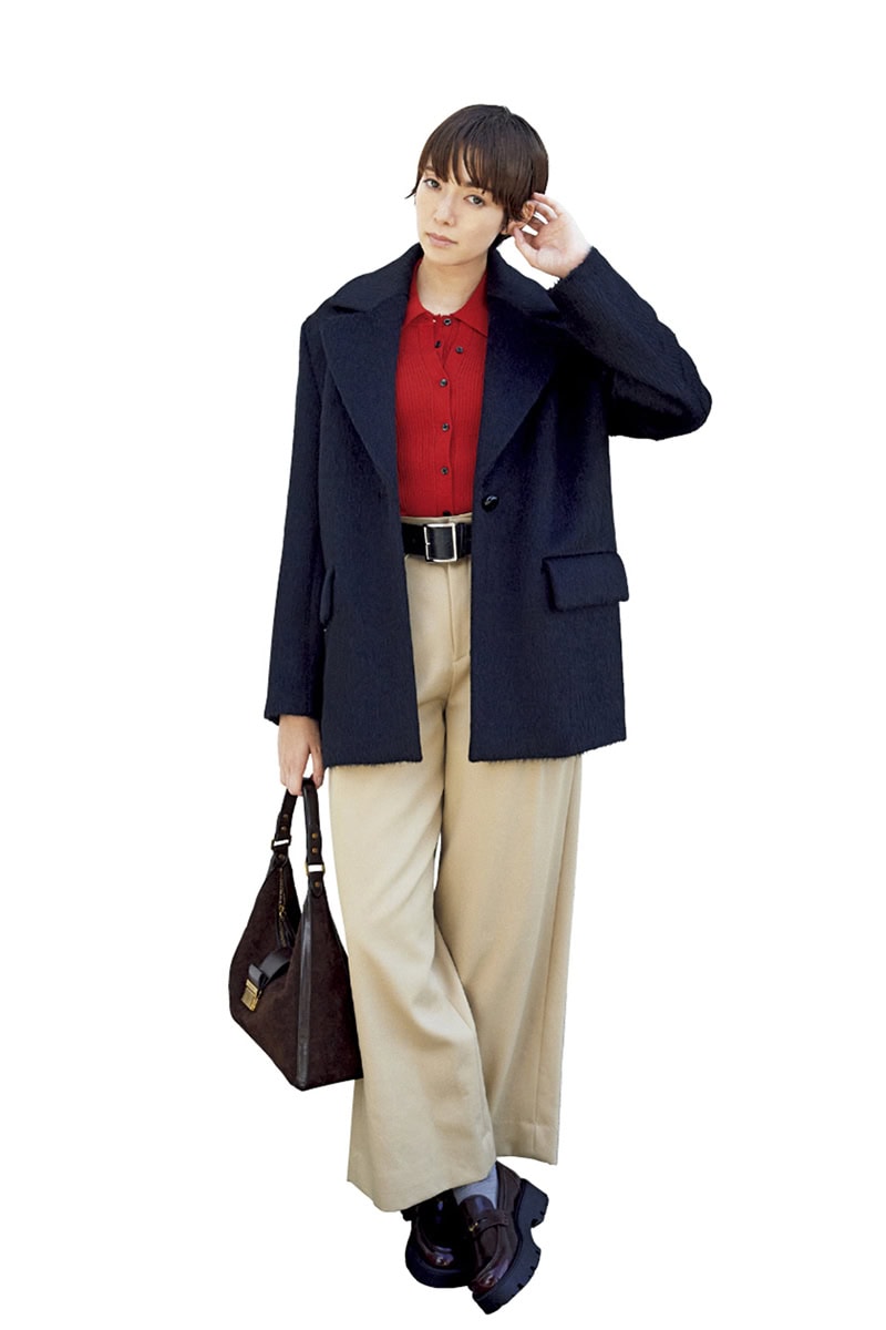 ジャコット¥262,000(デ·プレ) ポロニット¥3,990(ジーユー) パンツ¥47,300(キャバン/キャバン 丸の内店) ベルト¥15,180(オブラダ/シンチ) バッグ¥16,900(チャールズ&キース/チャールズ&キース ジャパン)