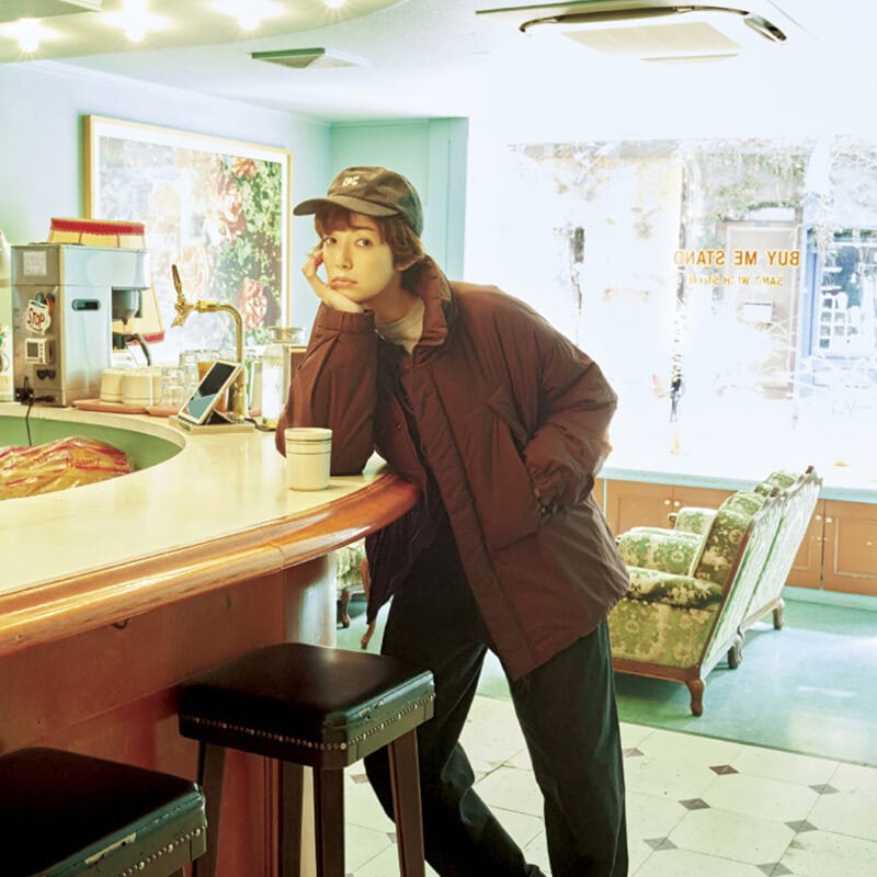 ブルゾン¥19,910(ファーストハンド) カーディガン¥22,000(ウーア/Uhr Online Store) 中に着たTシャツ¥13,200(ザ ポーズ/ウィム ガゼット ルミネ有楽町店) パンツ¥36,300(オブラダ/シンチ) キャップ¥11,000(ラック オブ カラー/ジャック·オブ·オール·トレーズ プレスルーム) シューズ¥33,000(ALM.)