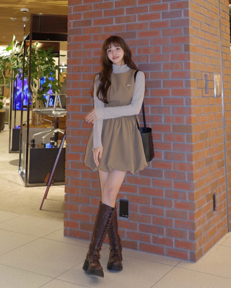 バルーンシルエットのミニワンピを主役にした冬コーデをキャッチ。ワンピの中にはGUのボーダーニットをIN。ベージュカラーの細ボーダーニットなので、全体的にまとまりがよく、トレンド感も演出できます。足元はロングブーツをセレクト。ミニワンピと丈バランスもよく、ほどよくドレッシーに仕上がります。