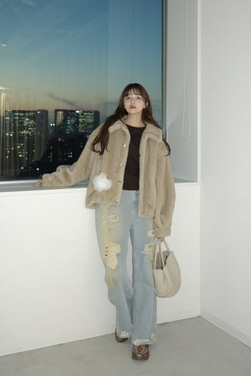 ファーコートにダメージデニムをあわせた、今年らしいカジュアルスタイル。ファーコートはボリュームがあるので、ダメージデニムのルーズな雰囲気がマッチ。足元は流行りのサロモンのスニーカーを投入して、好バランスに。ファーコートには真っ白のコサージュを足して、甘さもプラスしています。