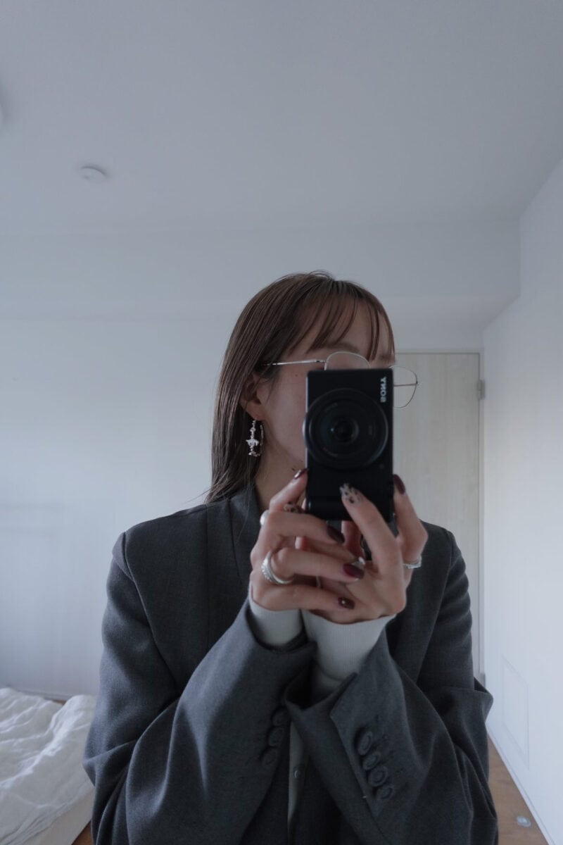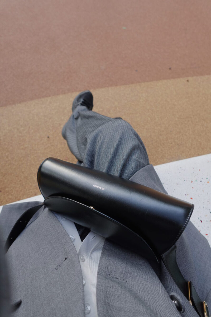 グレーのジャケットとパンツでセットアップ風に着こなした、冬のハンサムコーデ。中には白のニットを入れて、クリーンにまとめています。パンツはすそにスリットが入っているので、スニーカーをチラ見せして、ほどよく抜け感を演出しています。レザーのショルダーバッグとメガネもプラスして、かっちり感も。