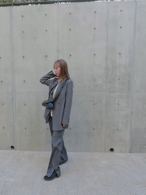 グレーのジャケットとパンツでセットアップ風に着こなした、冬のハンサムコーデ。中には白のニットを入れて、クリーンにまとめています。パンツはすそにスリットが入っているので、スニーカーをチラ見せして、ほどよく抜け感を演出しています。レザーのショルダーバッグとメガネもプラスして、かっちり感も。