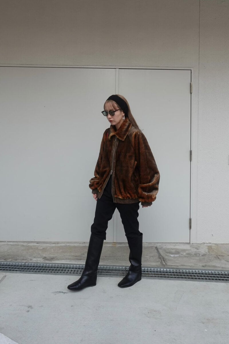 今季注目のファーコートを使った着こなしをスナップ。ボリューミーなファーコートには、スリムなパンツとロングブーツをあわせて、好バランスに。全体的にシンプルなカラーリングなので、赤のバッグを入れてアクセントにしています。太めのヘアバンドをONして目線アップも。