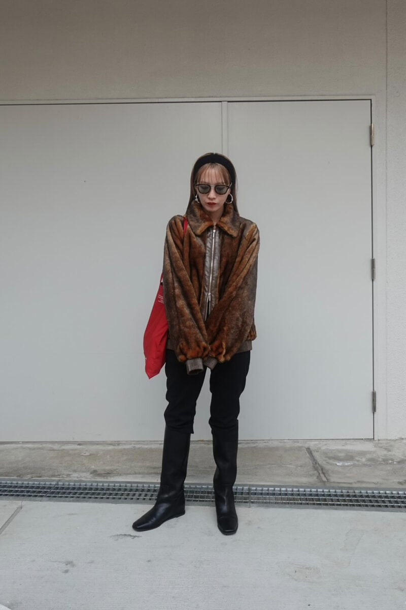 今季注目のファーコートを使った着こなしをスナップ。ボリューミーなファーコートには、スリムなパンツとロングブーツをあわせて、好バランスに。全体的にシンプルなカラーリングなので、赤のバッグを入れてアクセントにしています。太めのヘアバンドをONして目線アップも。