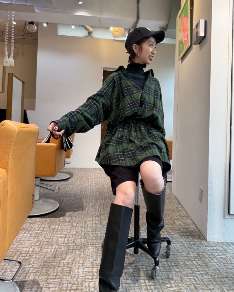 シャツワンピにショートパンツをあわせた、レイヤード術にセンスを感じる着こなしです。シャツワンピをブラウジングさせ、パンツとの丈バランスを工夫したのが上級者! シューズはロングブーツを選び、ボリュームをプラスしたのもポイント。さらにキャップをONして、目線を上げてスタイルアップも意識しています。