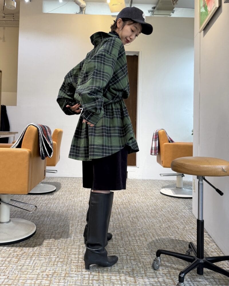 【30代スナップ】丈バランスが絶妙! シャツワンピ×ショートパンツで作る、今年らしいロングブーツスタイル