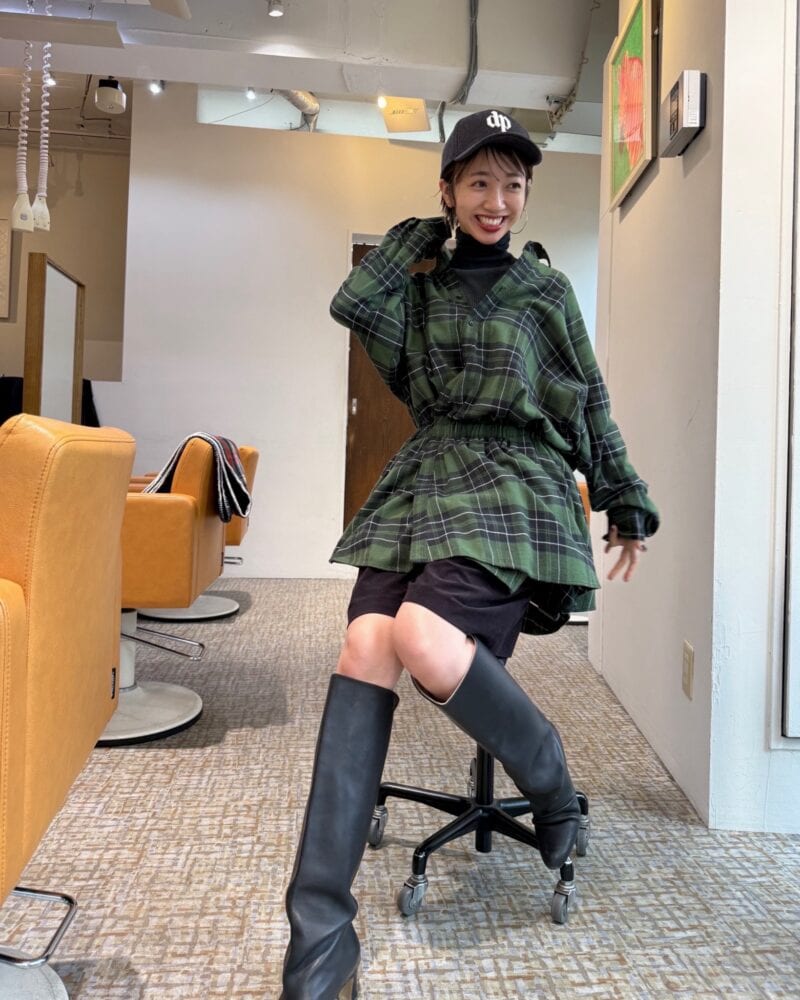 【30代スナップ】丈バランスが絶妙! シャツワンピ×ショートパンツで作る、今年らしいロングブーツスタイル