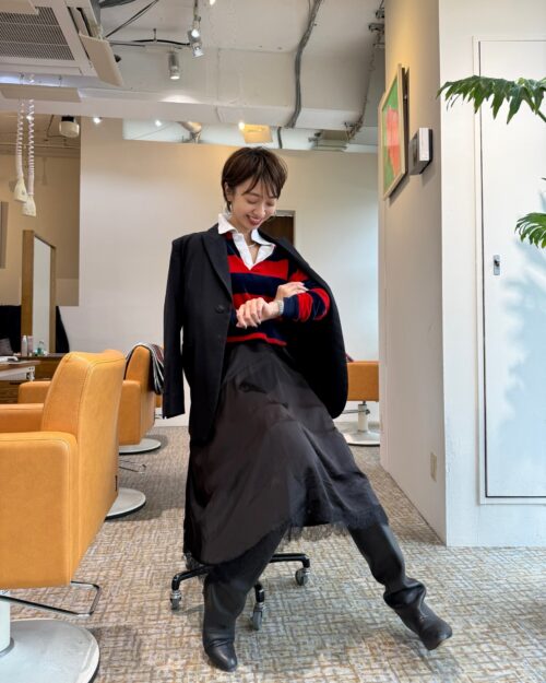 ポロラガーシャツを使ったスポーツMIXコーデをスナップ! 今冬トライするなら、ブラックアイテムを多めに使うのが成功の秘訣。黒のレースワンピやロングブーツをあわせたことで、大人の女性らしさもアピールできます。ヘアも、オイルとコームを使ってタイトに仕上げて、洒落感を上げています。