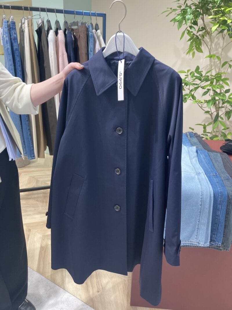 スタイリスト深田さん後ろが広がっているAラインの形が可愛い!ステンカラーのデザインだけどハンサムすぎず着られそうです。丈感もお尻が隠れるくらいの絶妙な長さで甘くならないのもいい。どちらの色も可愛いですが、私はネイビー推しです!チノバレルパンツとも相性◎