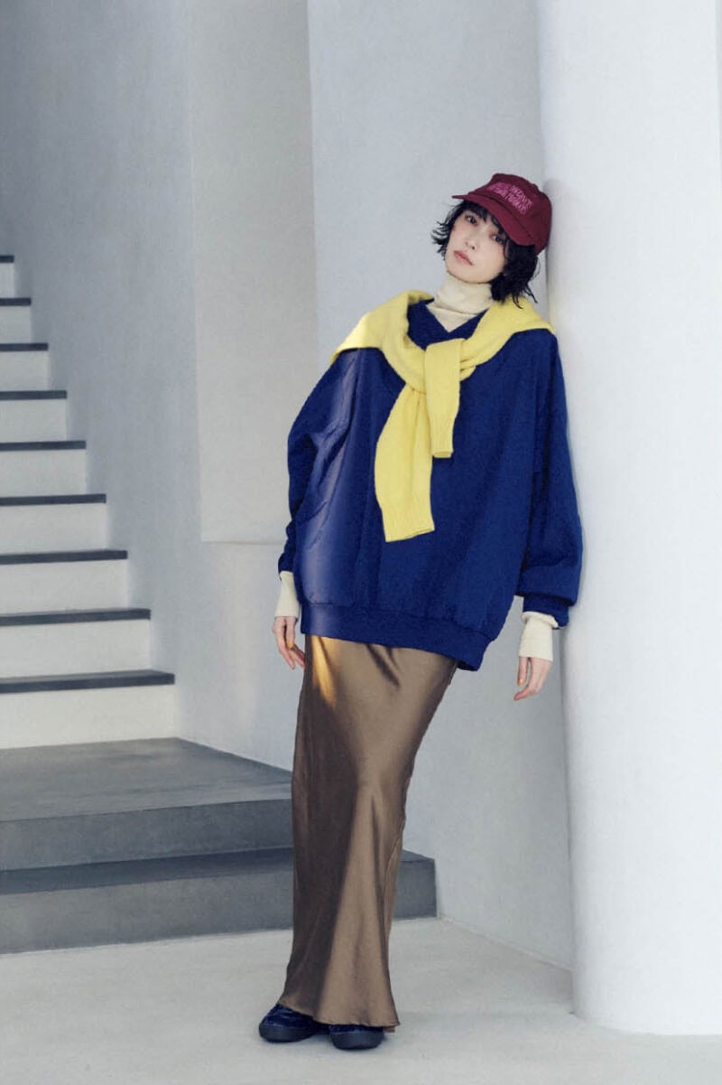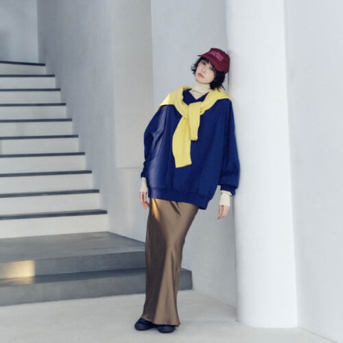 カジュアルな装いに光沢感のあるスカートで甘さを忍ばせてセンスアップ。別注Vネックプルオーバー¥12,100、タートルトップス¥5,500、スカート¥7,920、肩に巻いたニット¥13,200、キャップ¥4,400(すべてアウトドアプロダクツ/アウトドアプロダクツ ユージュアル シングス 中目黒) スニーカー¥13,750(ル タロン/ル タロン 有楽町マルイ店)