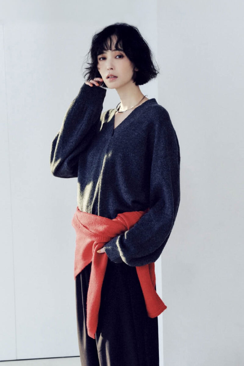 適度に開いたVネックや体が泳ぐシルエット、さらに柔らかく肌に寄り添うニット素材で上質見えするハンサムルック。鮮やかなカラーが目を引く三角フォルムのニットスカーフを腰巻きして、ただのベーシックで終わらせない差がつくスタイルに。ニット¥11,000、パンツ¥11,000、ニットマルチスカーフ¥9,000(すべてスタジオ ドー) チョーカー¥3,630(ダナエ∴/ススプレス)