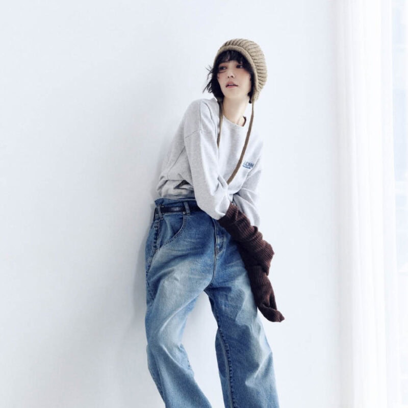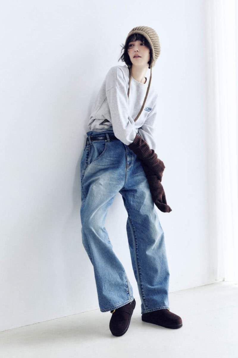 ウエストデザインが新鮮なデニムにスウェットをイン。ビーニーやアームウォーマーで温かみと洒落感を同時にプラス。