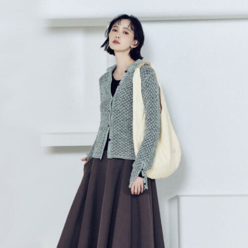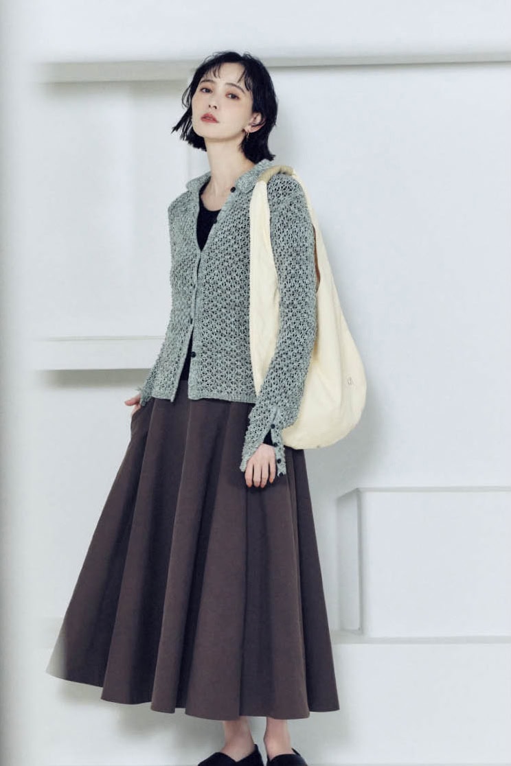 温かみのあるシアーカーデとスカートの優美なドレープがドラマティックなコンビネーション。シンプルで飾らないワンツーコーデも素材やシルエットで程よい甘さを添えて。ニットカーディガン¥19,800、トップス¥12,100、スカート¥19,800、バッグ¥7,480、シューズ¥19,800(すべてマノフ/クラネデザイン) ピアス¥4,400(ダナエ∴/ススプレス)