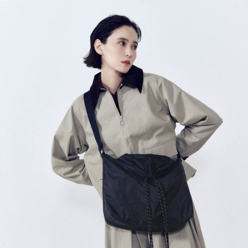 ビッグサイズのクロスボディながら、端正なスタイリングにもしっくりなじむスタイリッシュな顔立ちのバッグ。バッグ¥16,500(リンク) ジャケット¥11,000、スカート¥7,990(ともにザ ショップ ティーケー)、中に着たシャツ¥7,920(クロエンス/すべてワールド プレスインフォメーション)