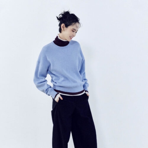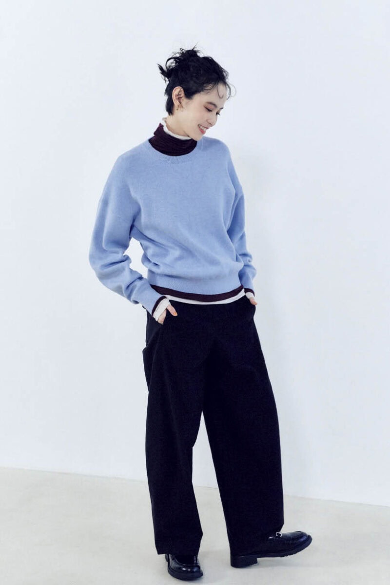 体が泳ぐ絶妙なシルエットのニットとバレルパンツで、肩肘張らないリラックスカジュアルなスタイル。インナーのシアータートルは2枚重ねて奥行きを出すことで差がつく鍵に。スムースコットンクルーネックセーター¥3,990、ヒートテックタートルネック 各¥2,290(すべてユニクロ:シー)、ジャージーバレルレッグパンツ¥3,990(ユニクロ/すべてユニクロ) ビットローファー¥2,990(ジーユー) ピアス¥4,400(ダナエ∴/ススプレス)